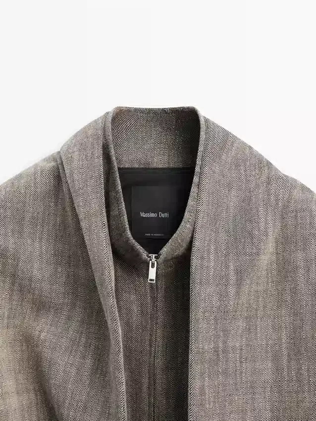 Bomberjacke aus einer Wollmischung. Knopfleiste vorne. Schals am Hals. Elastisches Band am Saum. Finish mit Sprenkel-Effekt. Fließender und leichter Stoff.