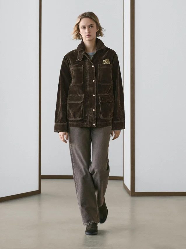 Jeansjacke. Lange Ärmel mit geknöpften Manschetten. Verdeckter Reißverschluss mit Druckknopfleiste. Vier aufgesetzte Taschen. Flock-Finish, samtiger Effekt, fühlt sich weich an. Kragenverzierung.