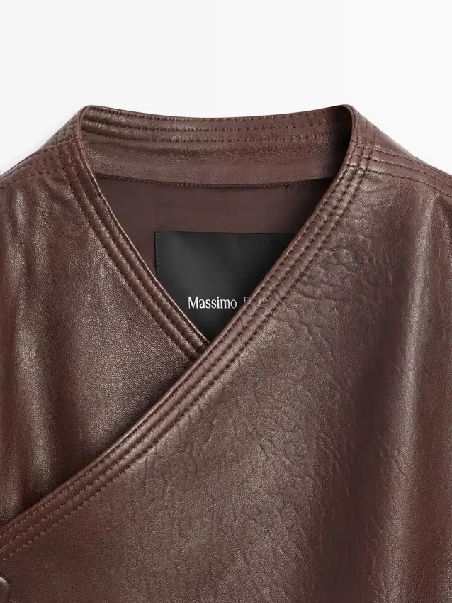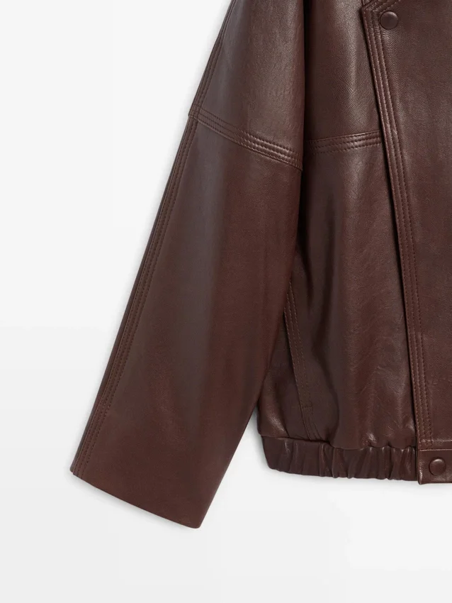 Bomberjacke. Lange Ärmel. Elastischer Bund. Überkreuzverschluss mit Reißverschluss und zwei Knöpfen. Zwei Seitentaschen. Aus Rindsleder.