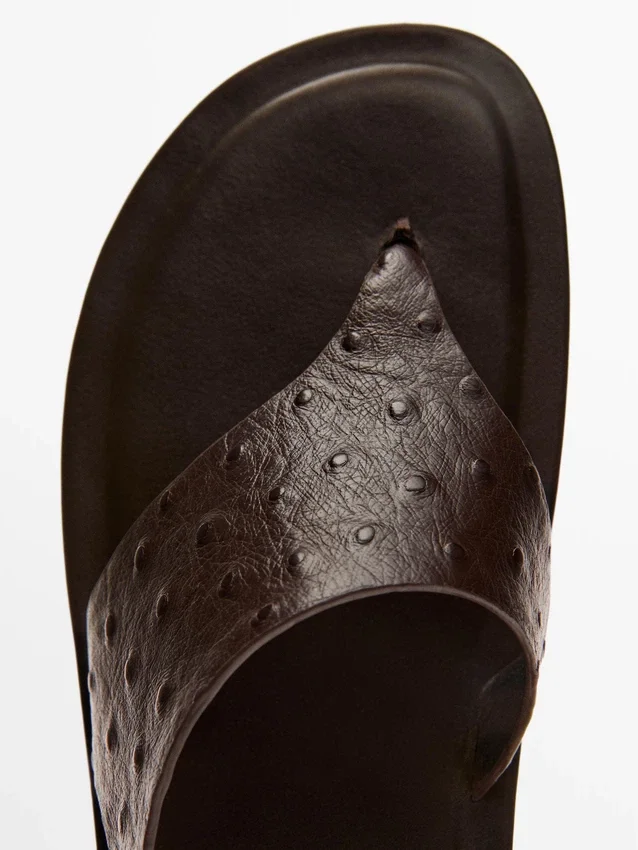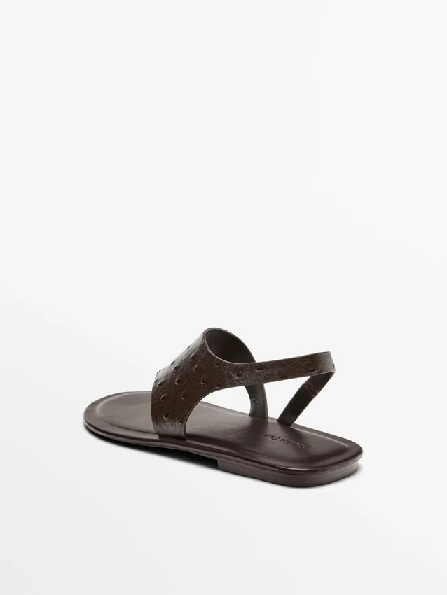 Flache Slider-Sandalen aus Schafsleder. Elastischer Riemen an der Ferse. Lederfutter und -innensohle. Leder mit geprägter Animal-Print-Optik. Zehentrenner. Ledersandalen.