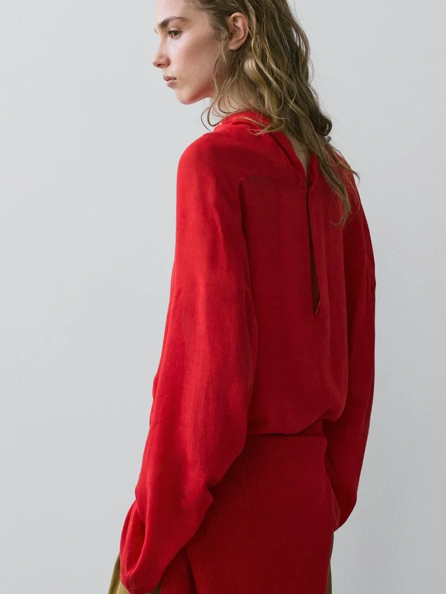 Fließende Bluse. Drapierter Kragen. Lange Ärmel. Knopfverschluss am Rücken und tropfenförmiger Ausschnitt.