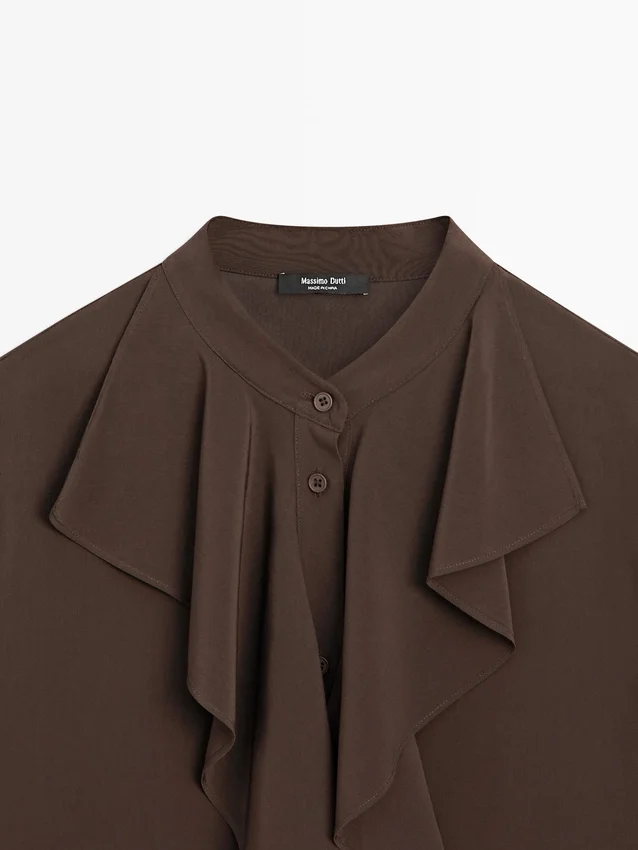 Fließende Bluse mit langen Ärmeln. Stehkragen. Knopfleiste vorne. Rüschenverzierung.
