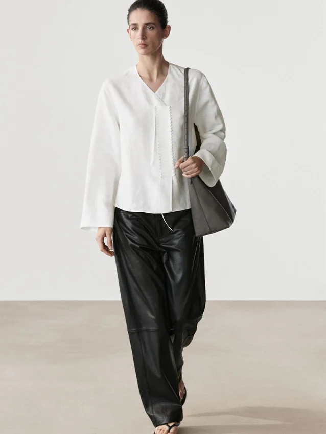 Hemd aus 100 % Leinen. Weite, lange Ärmel. Knopfleiste vorne. Überkreuz-Ausschnitt. Detail an der Brust.
