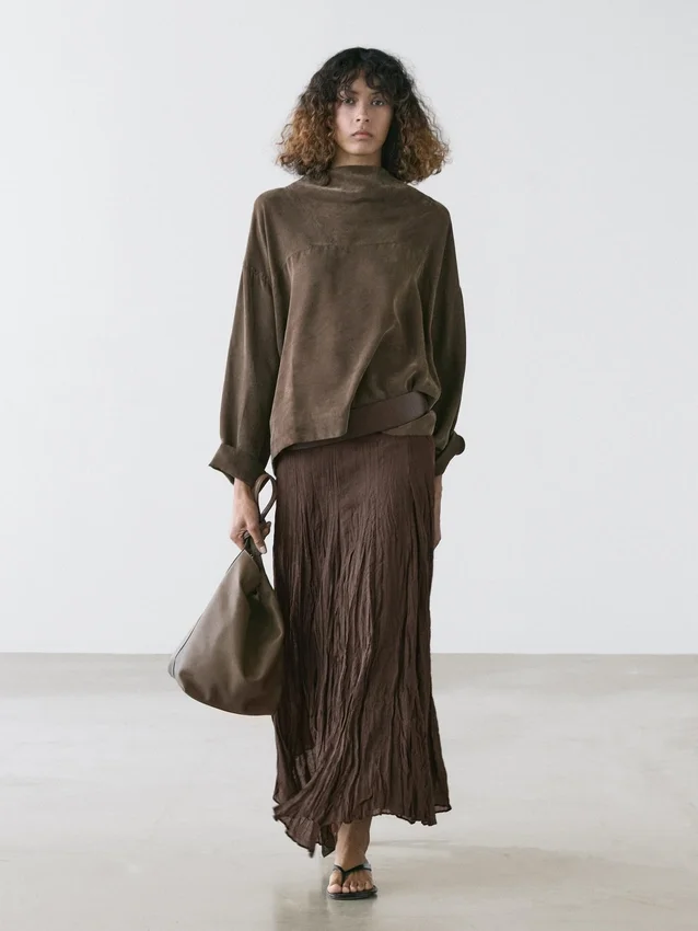 Fließendes Hemd. Weite, lange Ärmel. Drapierte Ausschnittdetails.