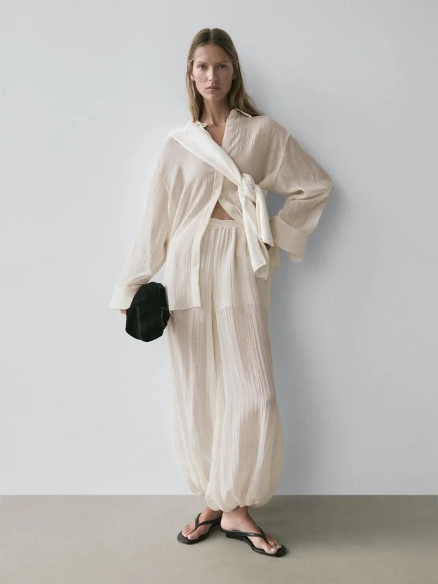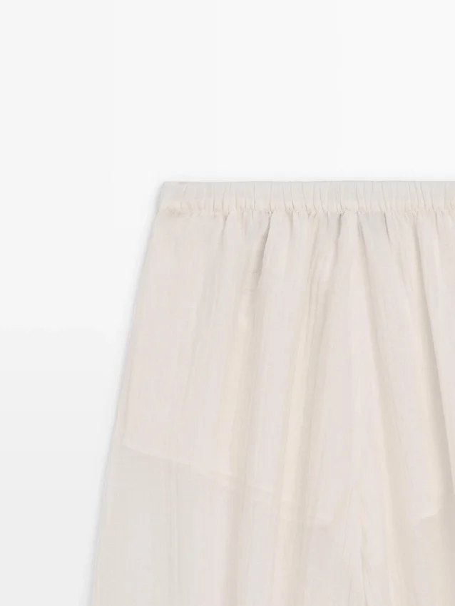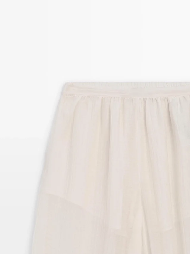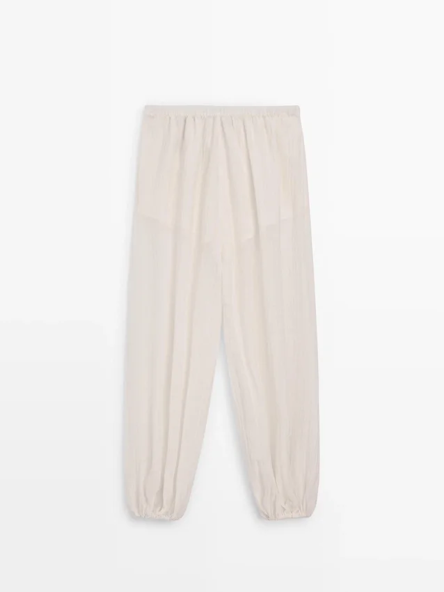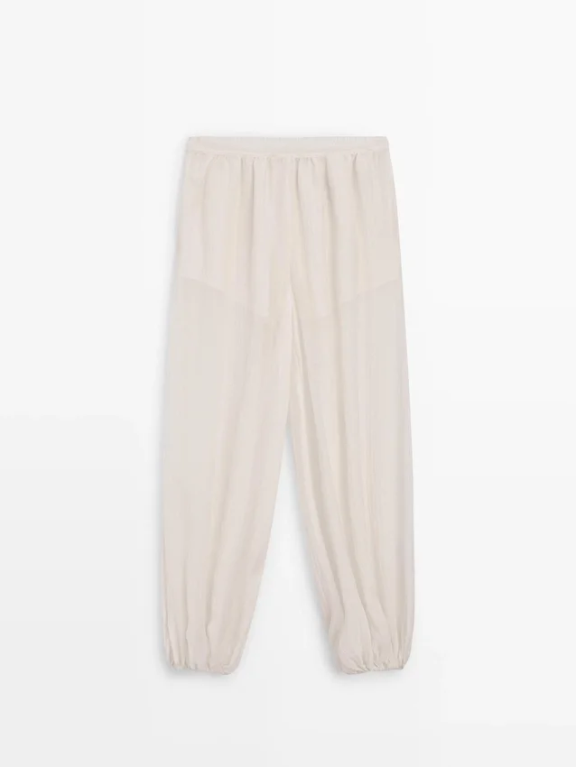 Hosen aus fließendem, plissiertem Stoff. Elastischer Bund. Elastisches Band am Saum. Halbtransparenter Stoff. Passendes Kleidungsstück erhältlich.