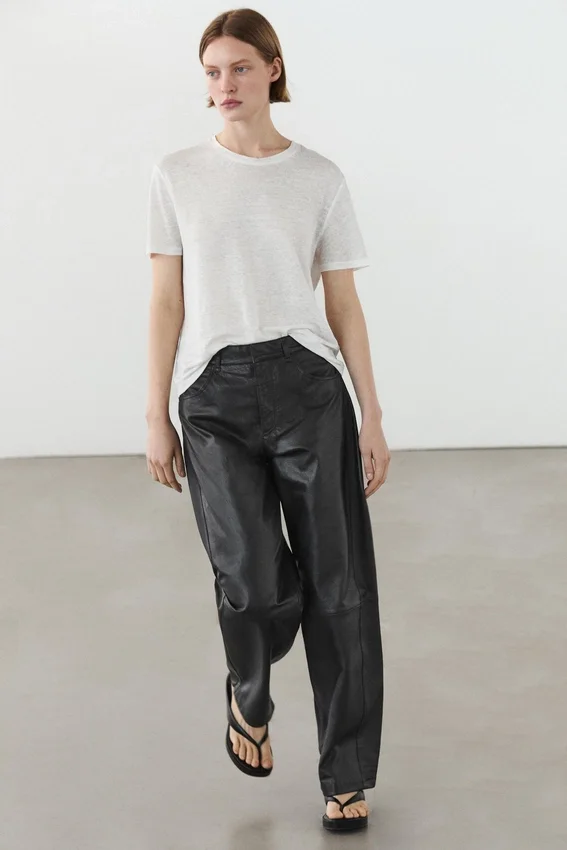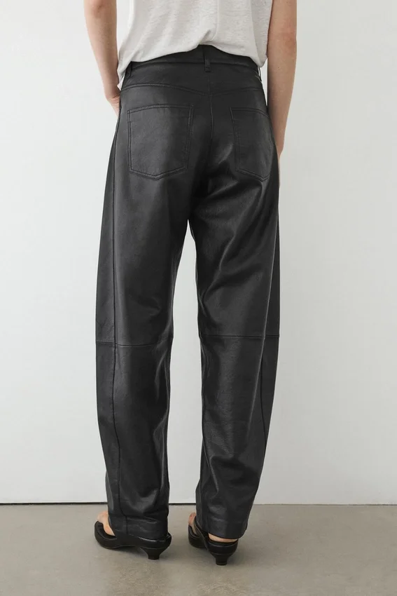 Hosen aus Schafsleder mit Nappa-Finish. Bund mit Gürtelschlaufen. Reißverschluss, verdeckt durch eine Blende, Druckknopf und geknöpftes Band. Zwei Seitentaschen. Zwei aufgesetzte Taschen auf der Rückseite. Gefüttert.