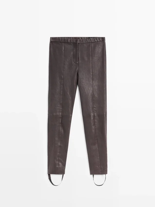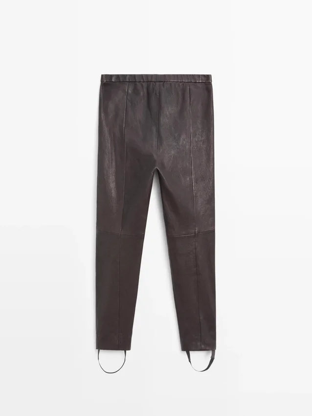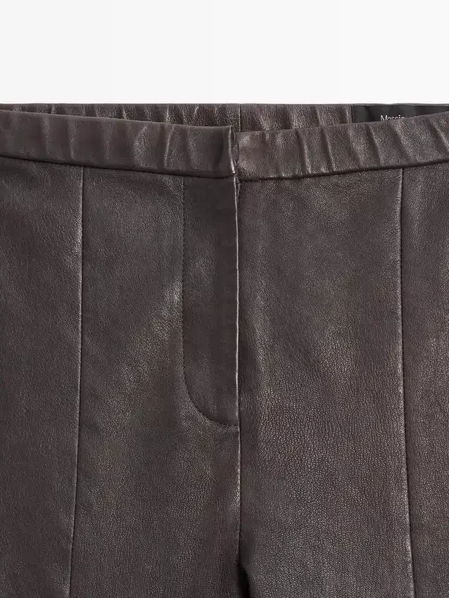 Hosen aus Schafsleder mit Nappa-Finish. Reißverschluss und Haken- und Ösenverschluss mit Knopf innen. Elastischer Bund. Elastisches Band am Saum. Nahtdetails. Abnehmbarer Gummizug.