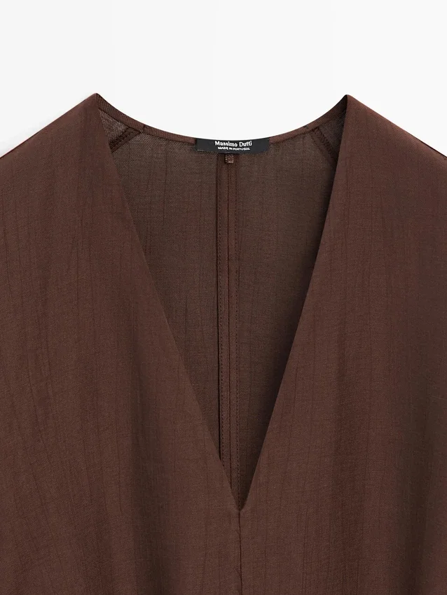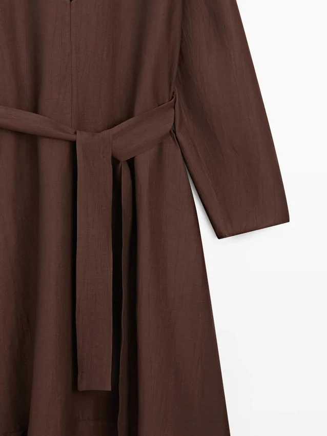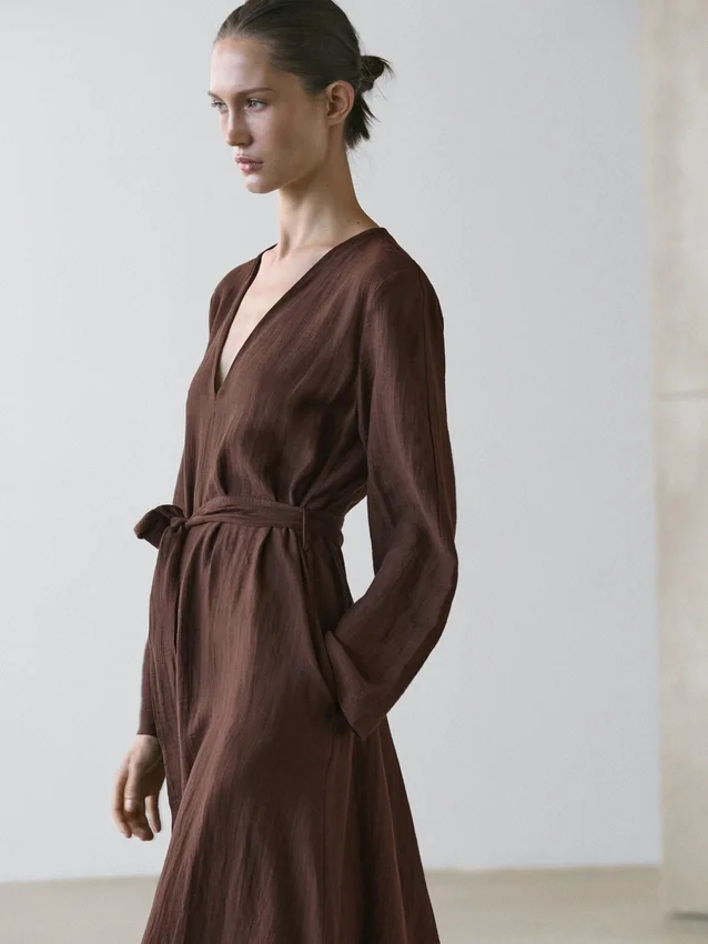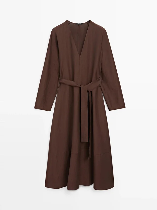 Midi-Kleid aus einer Leinenmischung. V-Ausschnitt. Lange Ärmel. Inklusive Gürtel.