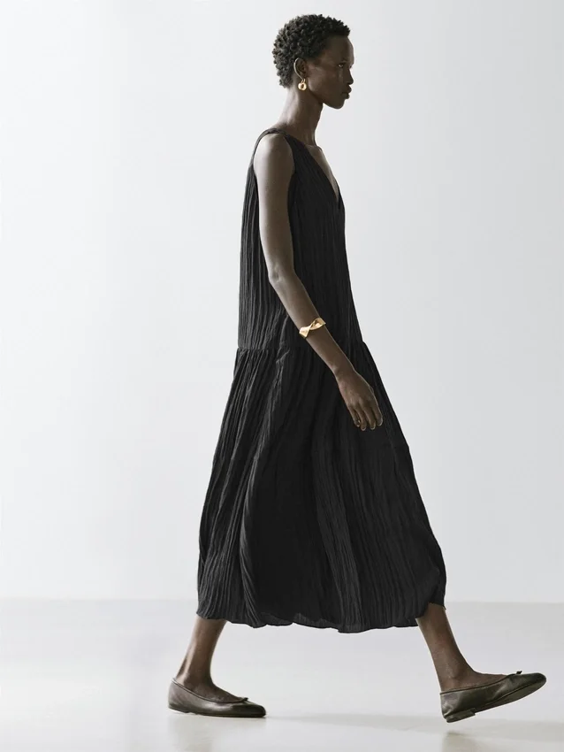 Midi-Kleid mit Plissee-Optik. Breite Träger. V-Ausschnitt. Baumwollfutter. Fließender und leichter Stoff.