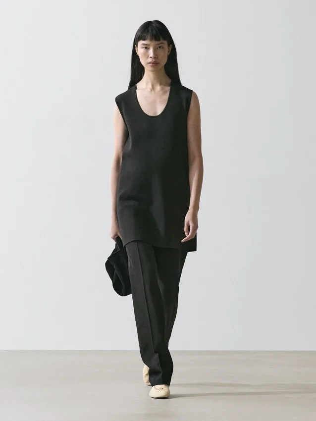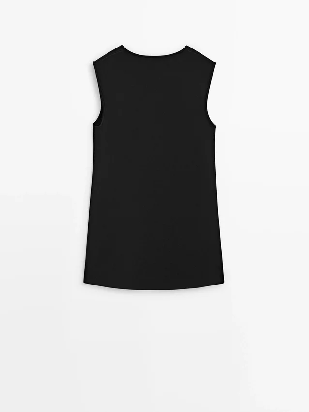 Rundhalsausschnitt. Ärmellos. Fließender Stoff.