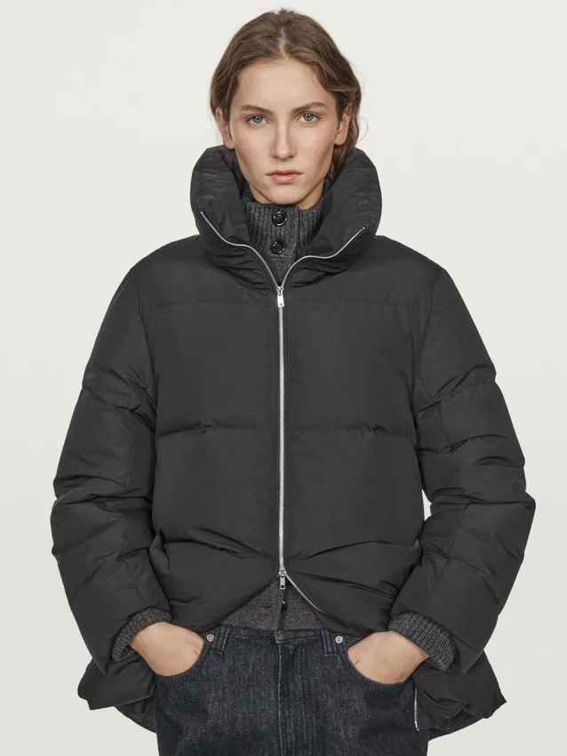 Steppjacke mit 80 % Daunen- und 20 % Federfüllung. Lange Ärmel. Mit Zwei-Wege-Reißverschluss. Hoher Kragen. Zwei Seitentaschen. Schals am Hals. Wasserabweisendes Material.