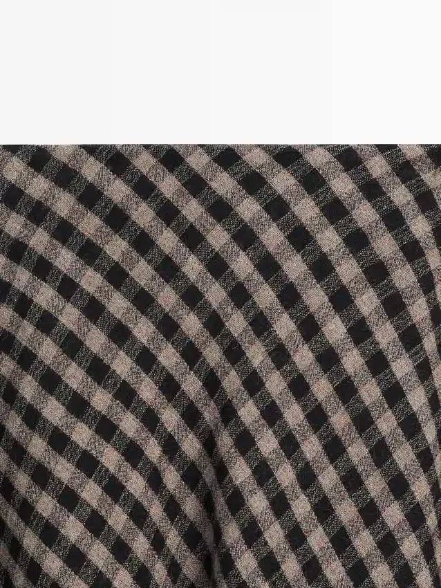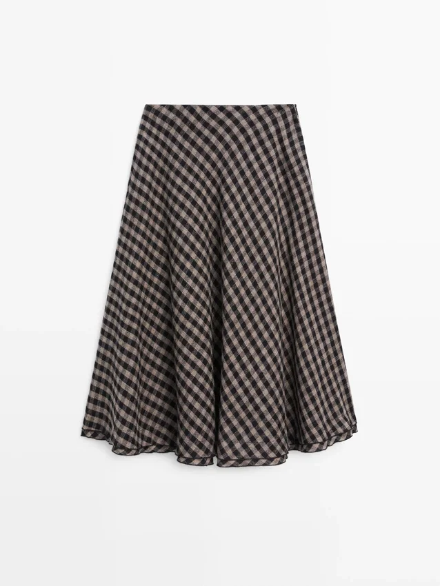 Midirock aus einem Wollmischgewebe. Reißverschluss an der Seite. Ausgestellt. Zwei Seitentaschen. Karomuster. Fließender und leichter Stoff.