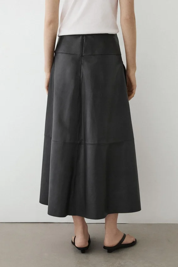 Midirock aus 100 % Schafsleder. Taillierter Korsettgürtel an der Taille. Reißverschluss. Gefüttert. Nahtdetails.