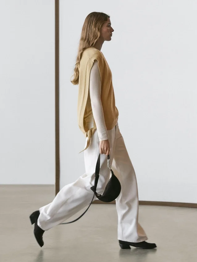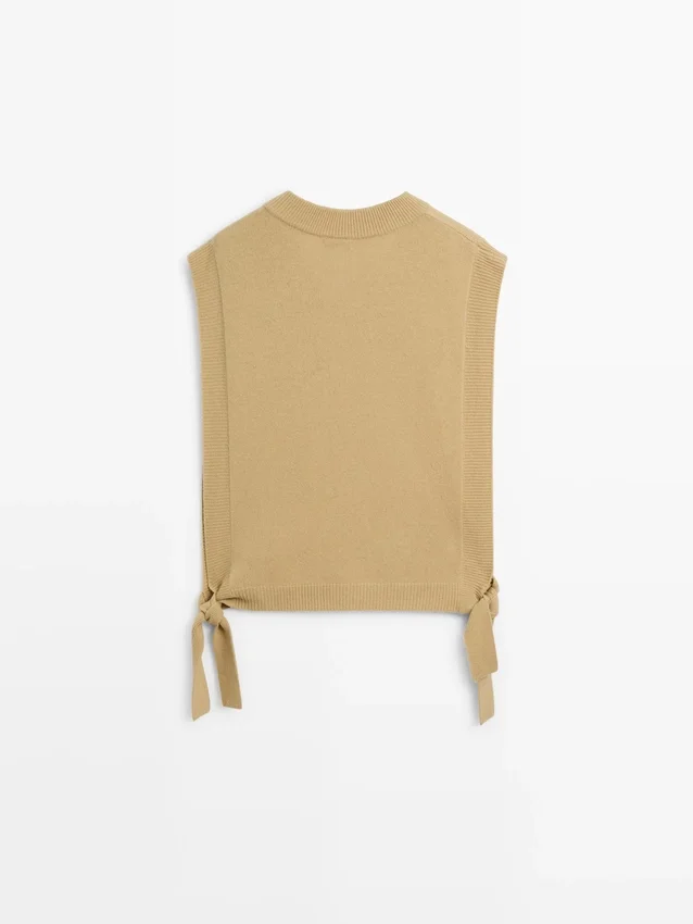 Dünnes, langes Oberteil aus Baumwollmischgewebe. V-Ausschnitt. Schlaufe an der Taille. Gerippte Säume.