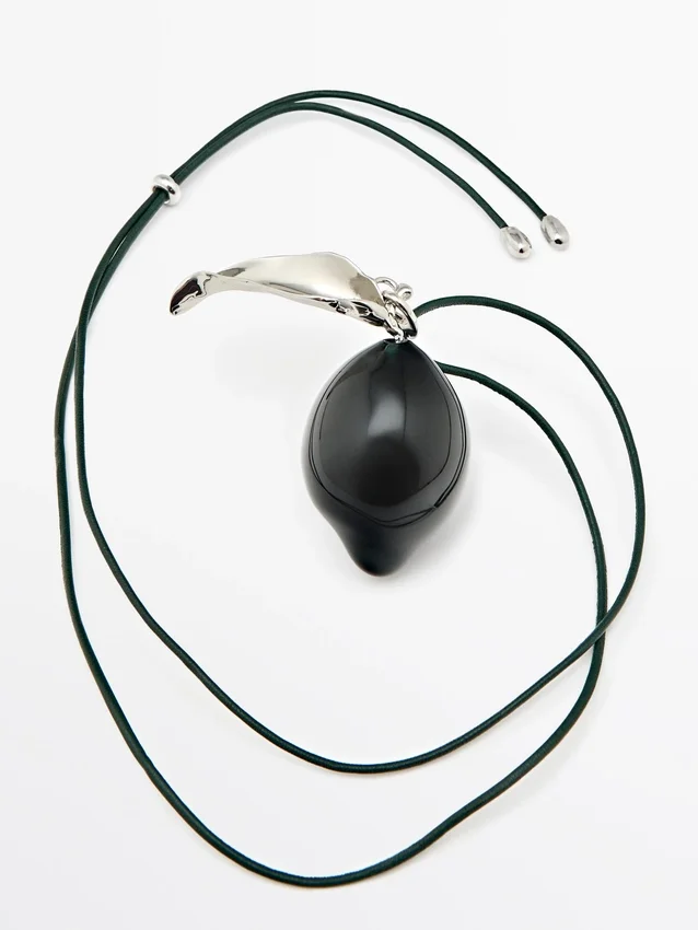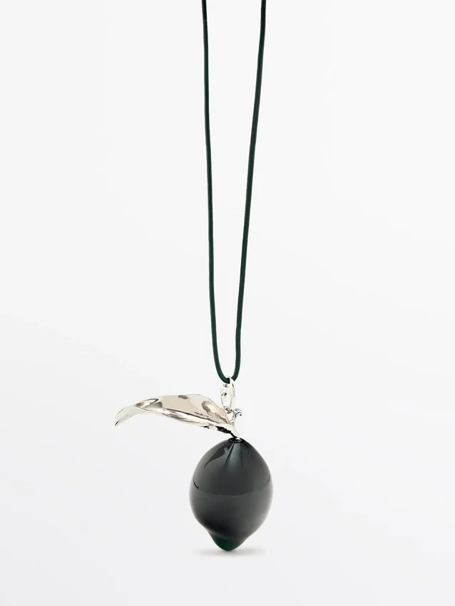 Halskette aus Lederband mit Glasanhänger und Blattdetail. Kordelzugverschluss.