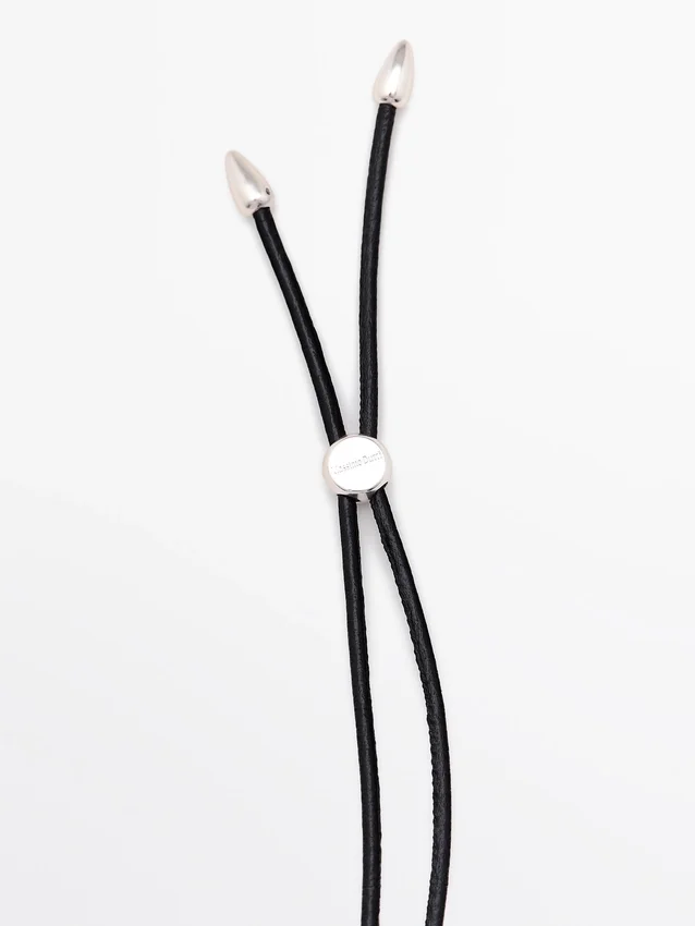 Halskette aus Lederband mit Metallverschluss. Kordelzugverschluss.