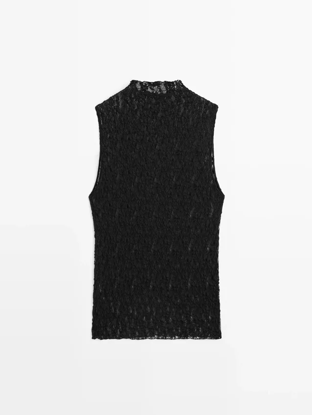 Halbtransparentes Spitzenoberteil. Hoher Kragen. Ärmellos. Stretchstoff.