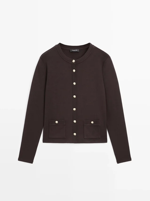 Cardigan. Rundhalsausschnitt. Lange Ärmel. Elegante goldfarbene Strassknöpfe. Zwei Pattentaschen mit Knöpfen.