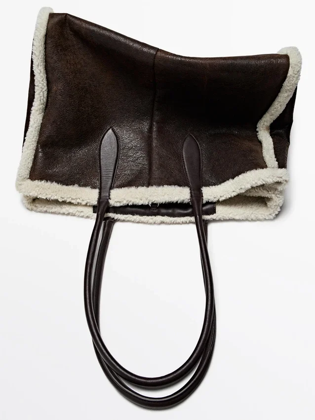 Maxi-Tasche aus Rindsleder mit Fell. Innenverschluss mit Schnalle. Zwei Griffe und/oder Schulterriemen.