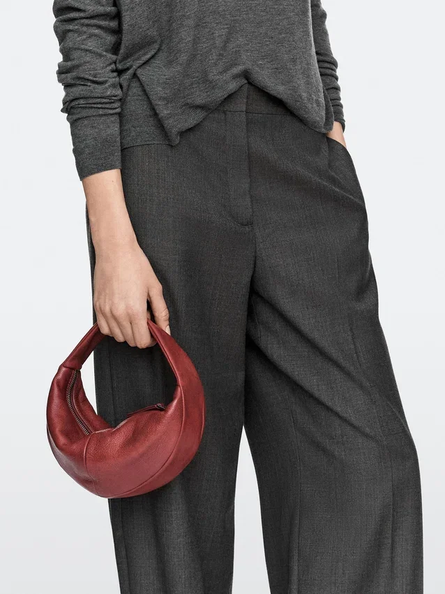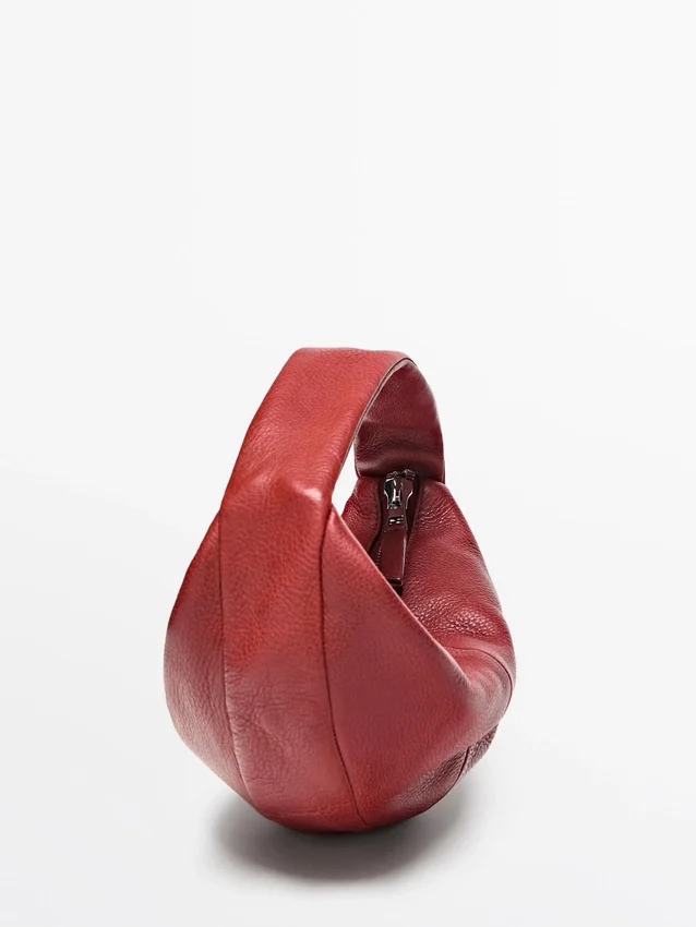 Halbmondtasche aus Rindsleder. Reißverschluss. Handgelenkriemen. Gefüttert.