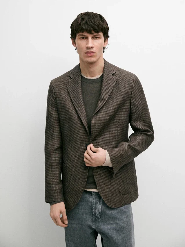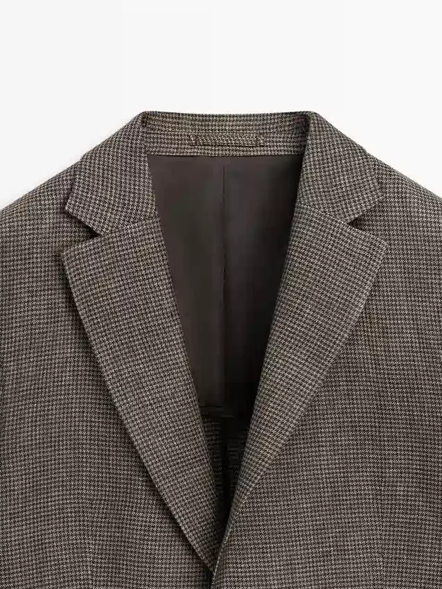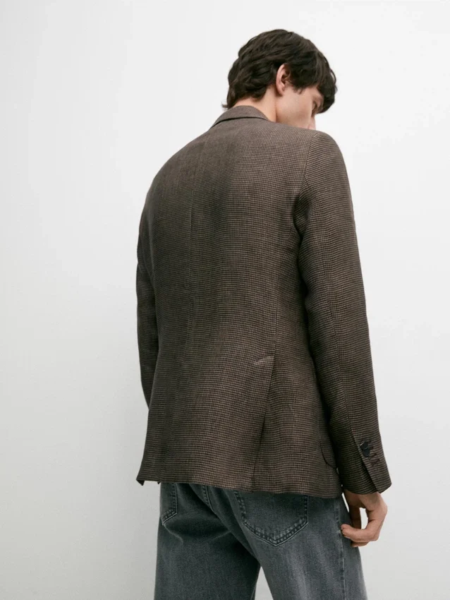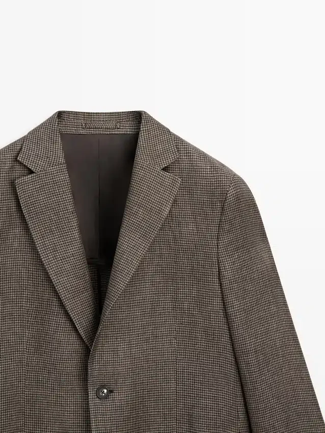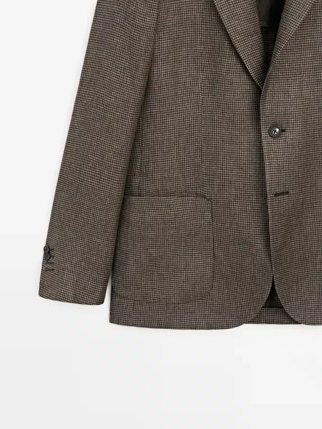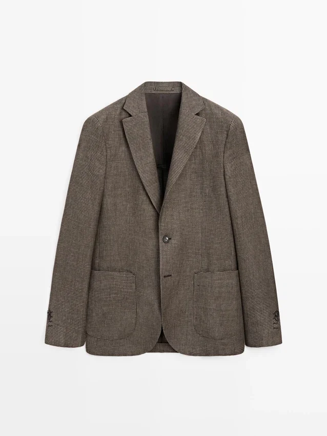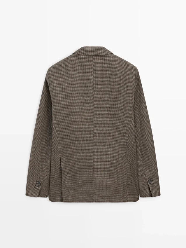 Blazer aus 100 % Leinen. Reverskragen. Lange Ärmel mit geknöpften Manschetten. Zwei-Knopf-Verschluss. Zwei aufgesetzte Taschen. Zwei Schlitze hinten. Gefüttert. Hahnentrittmuster.