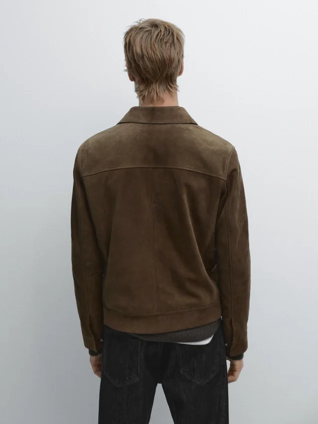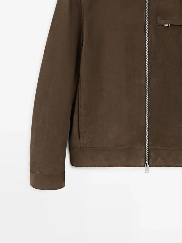 Jacke aus Rindsleder mit Nubuk-Finish. Hemdkragen. Lange Ärmel. Mit Zwei-Wege-Reißverschluss. Eine Brusttasche mit Reißverschluss.