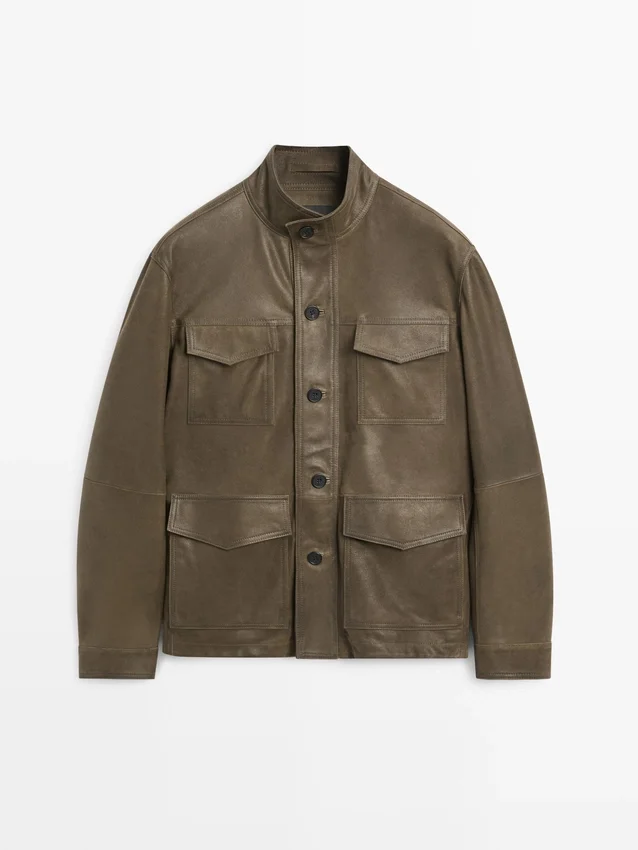 Jacke aus Ziegenleder. Lange Ärmel mit geknöpften Manschetten. Knopfleiste vorne. Hoher Kragen. Vier aufgesetzte Taschen mit Patten. Nahtdetails. Used-Look.