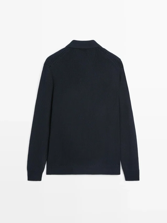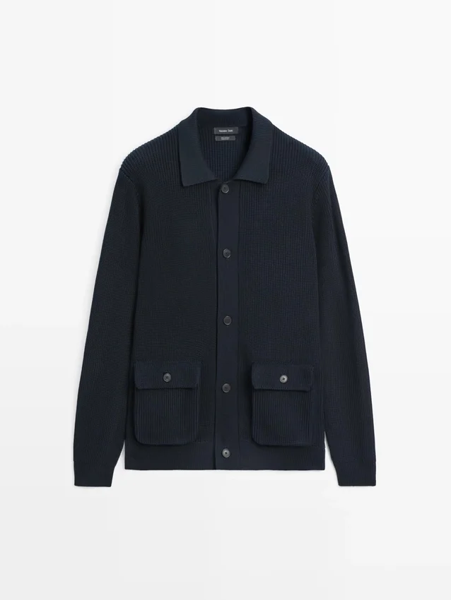 Cardigan aus 100 % Baumwollstrick. Lange Ärmel. Knopfleiste vorne. Poloshirts. Zwei Pattentaschen mit Knöpfen. Gerippte Säume. Gerippter Stoff.
