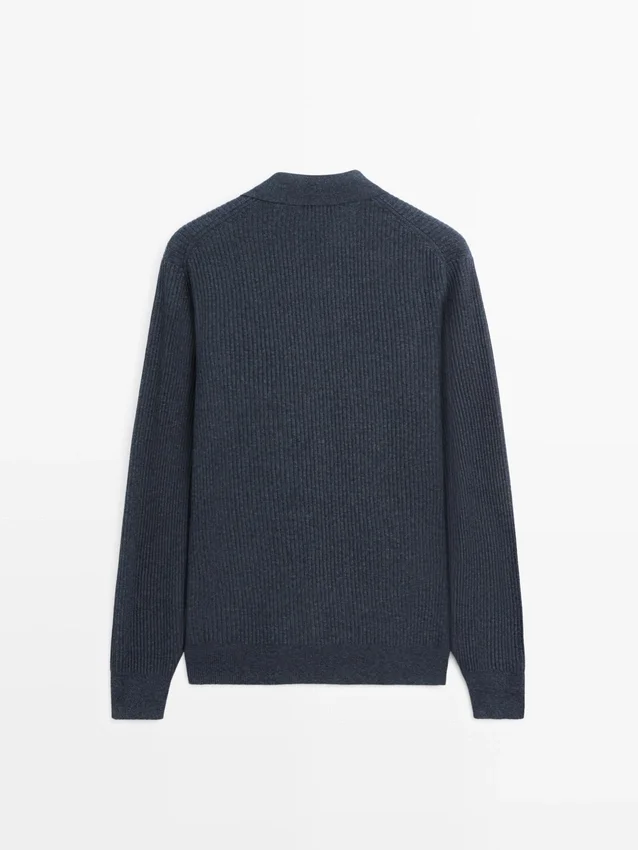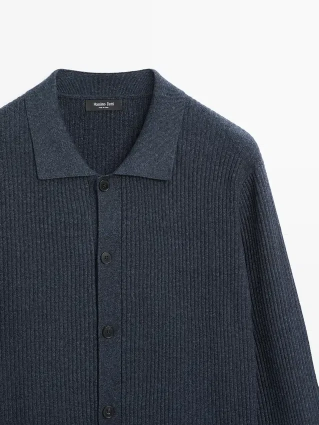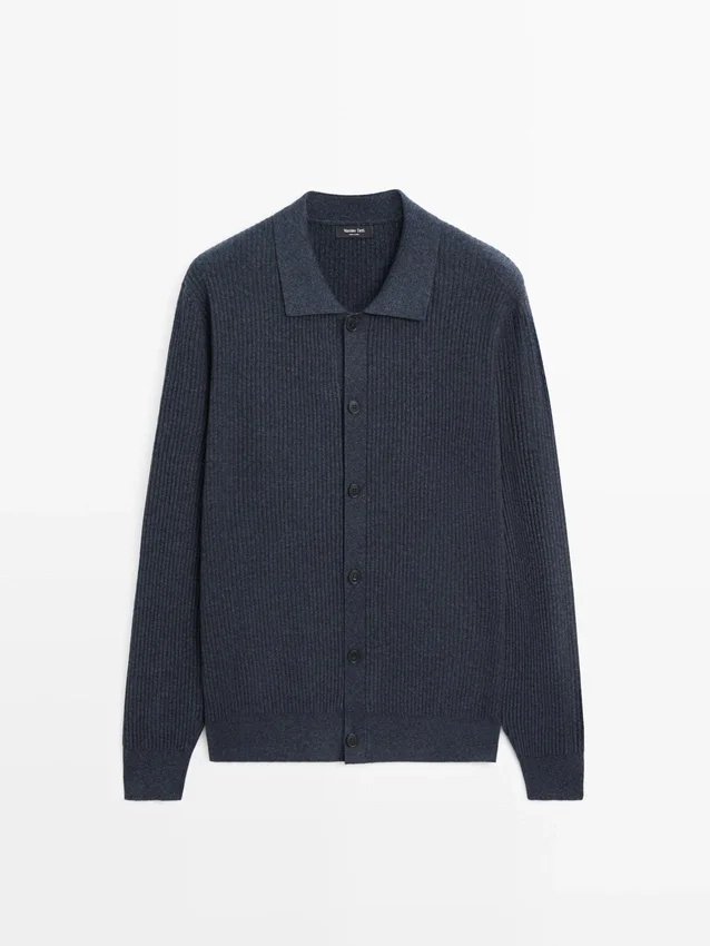 Cardigan aus einer Baumwollmischung. Lange Ärmel. Knopfleiste vorne. Poloshirt-Kragen. Gerippte Säume. Gerippter Stoff.