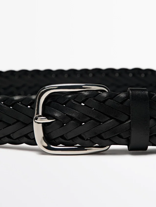 Gürtel aus Rindsleder. 3,5 cm breit. Große ovale Metallschnalle. Detail mit Zopfmuster-Knoten.