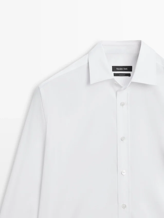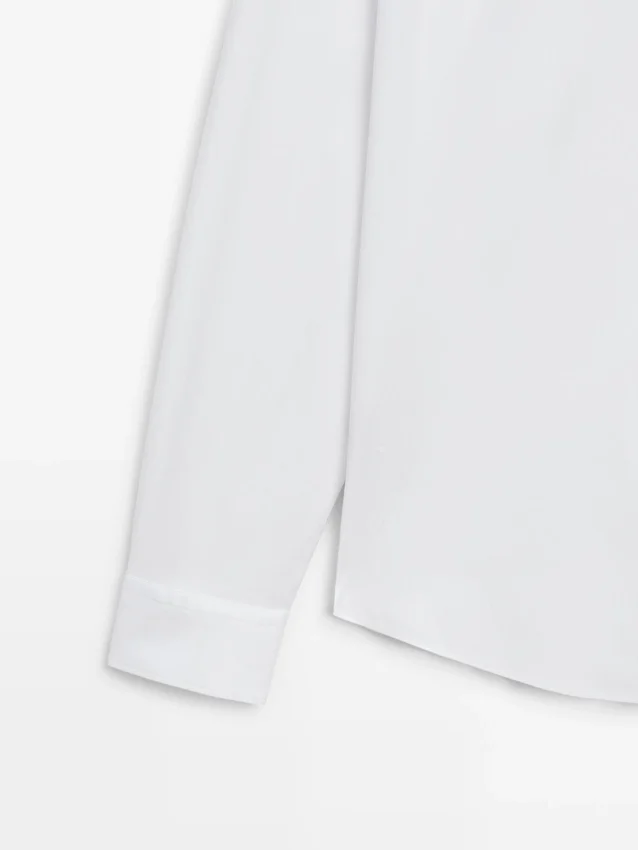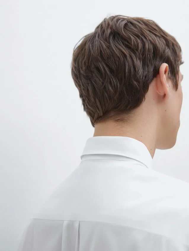 Hemden aus Stretchstoff. Slim-Fit-Hemd: Diese Passform zeichnet sich durch eine leicht taillierte Silhouette aus, die an Oberkörper, Schultern und Armen eng anliegt und für eine definiertere und schlankere Optik sorgt. Hemd aus Baumwollmischgewebe. Lange Ärmel mit geknöpften Manschetten. Hemdkragen. Durchgehende Knopfleiste.