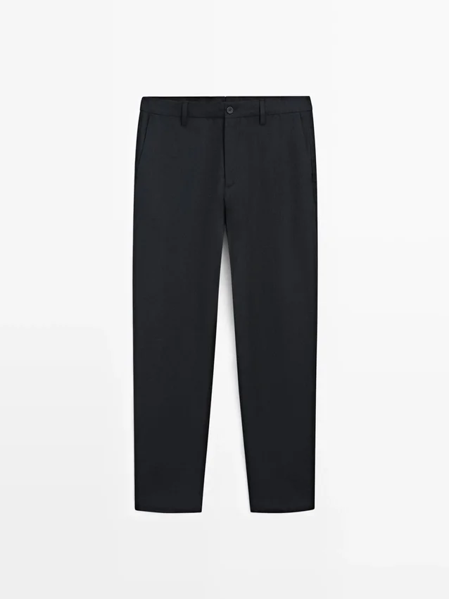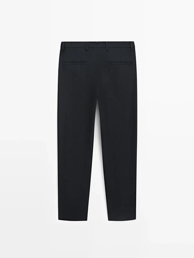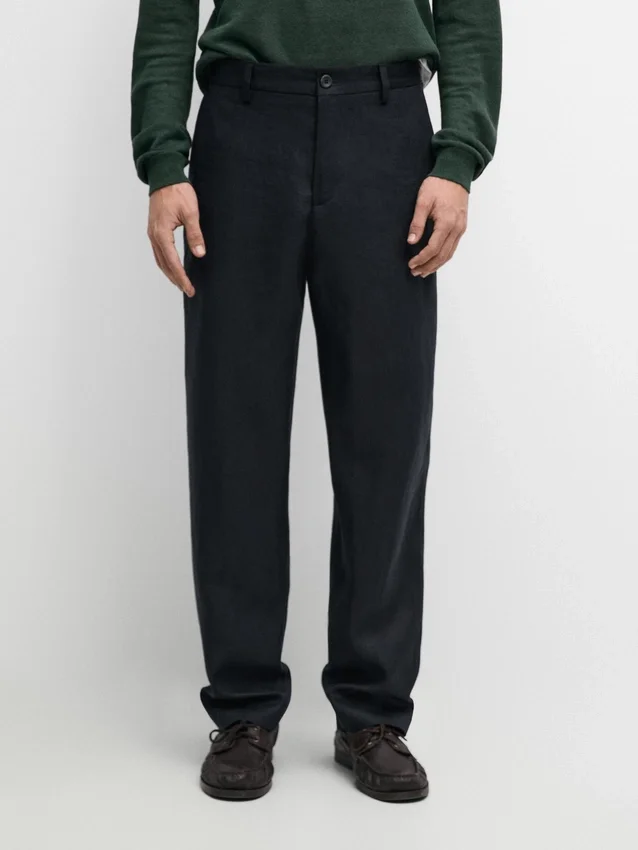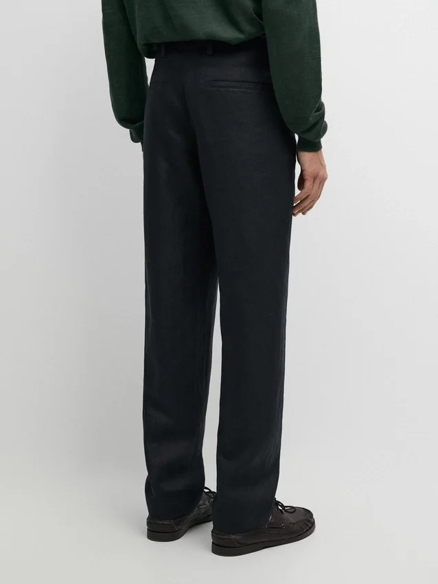 Hose aus Leinen als Hauptstoff. Reißverschluss, verdeckt durch eine Knopfleiste, Knopf und geknöpftem Riemen. Zwei Seitentaschen. Dieses Kleidungsstück ist Teil eines Anzugs.