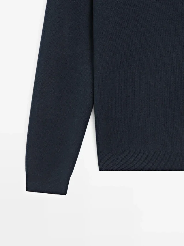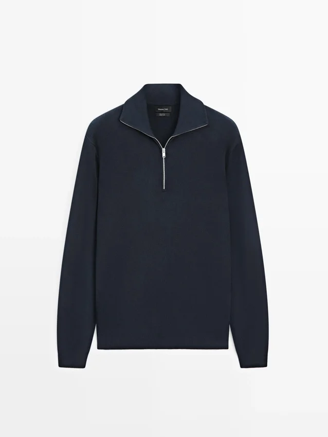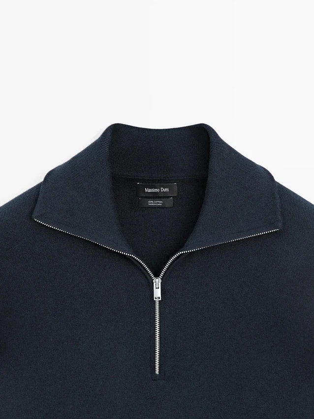 Strickpullover aus Baumwollstoff. Lange Ärmel. Reißverschluss am Hals. Stehkragen mit Reißverschluss. Gerippte Bündchen. Weicher Stoff, der sich angenehm anfühlt.